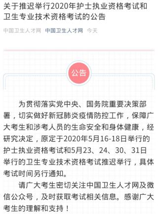 中国卫生人才网最新消息,护士执业资格考试与卫生专业技术资格考试时间推迟,这条消息对于考生而言是相当重要的。通知文件截图如下: 为贯彻落实党中央、国务院重要决策部署,切实做好新冠肺炎疫情防控工作,保障广大考生和涉考人员的生命安全和身体健康,经研究决定,原定于2020年5月16-18日举行的护士执业资格考试和5月23、24、30、31日举行的卫生专业技术资格考试推迟举行,具体考试时间另行通知。 请广大考生密切关注中国卫生人才网及微信公众号,及时获取考试相关信息。感谢广大考生的理解和支持! 考试时间虽然推迟了,但具体时间尚未公布,小编会持续关注动态消息,有结果及时告知各位考生。 我们能提前预知分数线,当然知道考什么!课程咨询热线:400-6286615 我们连续六年精准预测了护士考试分数线和考试大纲,扫描下面的“ChinaNERC”微信二维码或加QQ群号:457734051(护士)、471131230(护师)。即可提前获取各种最近护考信息: 扫一扫关注护理研究中心二维码 扫描下方金题二维码即可免费注册APP,海量模拟真题等你来!
