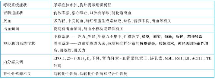 ④神经系统:可出现意识障碍、躁动、谵妄、抽搐、昏迷等尿毒症脑病症状。