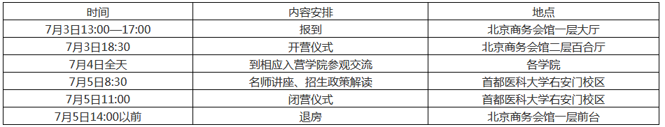 首都医科大学2019夏令营入营通知已发布,博傲教育为各位考生收集到以下信息,请相关考生注意。 经过我校研招办和各学院根据择优原则对申请材料进行的初审和筛选,共有204名同学获得了“首都医科大学2019年全国优秀大学生暑期夏令营”的入营资格。具体入营学生名单请见附件。 注:取得入营资格,但由于个人原因不能参加夏令营活动者,务必于入营名单6月24日8:00-11:30、13:30-17:00电话联系研招办(010-83911051、010-83916545)并发送邮件至电子邮箱ccmuzhaosheng@sina.com告知。对于学生放弃入营的情况,我们会在相应学院备选名单中递补学生入营。 获得入营资格的学生需要注意以下事项: 1、各学院(所)会与所有入营该学院的学生进行联系并建立微信群,请大家务必保持手机畅通,并及时关注微信群内的信息。 2、入营报到时间:7月3日13:00—17:00;报到地点:北京商务会馆一层大厅(北京市丰台区右安门外玉林里1号楼)。入营学生须在以上规定时间内在北京商务会馆一层大厅报到完毕。如有特殊情况不能在规定时间内报到的营员,请务必在各学院的微信群中和学院志愿者或管理老师进行联系。 3、入营报到须携带所有报名材料的纸质版(与之前提交的电子版材料相一致),包括:包括教育部学籍在线验证报告;专家推荐函原件1份;成绩单原件;成绩证明原件;英语等级成绩证明复印件(原件备查,单独存放);其他相关证明材料复印件、自荐信。相关材料的具体要求见夏令营招生简章。 将以上材料按顺序放入档案袋中(不装订),并在档案袋封面醒目位置注明:姓名、入营的学院及专业名称。 4、食宿安排及相关资助 食宿:我校将为入选营员提供夏令营期间在京的食宿(注:根据网上报名系统营员申请住宿情况安排,学校或家庭所在地是北京的学生不安排住宿);住宿时间:7月3日~5日中午12时止;请大家务必携带二代身份证,并在规定时间内办理入住和退房。 交通资助说明:我校仅报销来京参加夏令营的单程交通费,可报销的票据为入营学生本科学校所在地至北京的高铁二等座票、动车二等座票或者普快列车硬座票。请注意,如果入营学生选择以上所示可报销类型以外的交通方式抵达(如硬卧、飞机等),根据学校财务规定,学校只能按照与该交通方式相应出发站至到达站的“普快列车硬座票”的价格进行报销,余出的价格学生自行承担。 交通费报销所需材料 乘坐交通工具的票据。于报到当天提交至报到处(北京商务会馆一层大厅)。 本人银行卡卡号、所属银行、开户行等信息,请提前咨询清楚并于报到当天在报到处进行信息登记。 5、夏令营日程安排 以上便是相关内容,希望能给各位考生带来帮助。 20年来,我们只做医考培训!医考热线电话:400-6286615 扫描立即做题 [海量练习][历年经典]等你练!