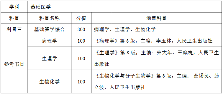 河北北方学院2020硕士研究生考试科目说明(西医)已发布,博傲教育为各位考生收集到以下信息,请相关考生注意。 一、2020年我校拟招收硕士研究生423人(不含退役大学生专项计划),其中全日制硕士研究生404人(基础医学22人、学术型临床医学50人、药学15人、作物学5人、农业硕士45人、临床医学硕士152人、中医硕士60人、教育硕士55人),非全日制硕士研究生19人。具体人数以教育部最终下达的计划为准。 二、考生报名条件参见河北北方学院2020年硕士研究生招生简章。 三、各专业招生计划,请考生详见《河北北方学院2020年硕士研究生拟招生计划》。 四、考试科目(一)学术学位 ...... 报考基础医学、临床医学学术型、药学,科目一为思想政治理论(101),科目二为英语一(201),科目三如下: 1.报考基础医学,科目三为基础医学综合(709),满分300分。科目三为学校自命题,包括生理学、生物化学、病理学各100分。 2.报考临床医学学术学位,科目三为西医综合(学术)(707),满分300分。科目三为学校自命题,包括生理学、生物化学、诊断学各100分(物理诊断50分,实验诊断50分)。 ...... (二)专业学位 1.报考临床医学专业学位,科目一为思想政治理论(101),科目二为英语一(201),科目三为国家统考(306)临床医学综合能力(西医),满分300分。 ...... 以上内容来自院校官网,希望能给各位考生带来帮助。 20年来,我们只做医考培训!医考热线电话:400-6286615 扫描立即做题 [海量练习][历年经典]等你练!