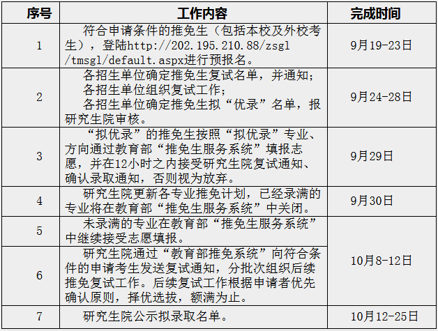 南京中医药大学2020硕士研究生推免接收方案已发布,博傲教育为各位考生收集到信息如下,请相关考生注意。 为确保我校2020年接收推荐免试硕士研究生复试及录取工作顺利完成,按照教育部和江苏省教育考试院有关文件精神,根据“全面考查、综合评价、择优选拔”的推免生评价体系和工作机制,现制定《南京中医药大学2020年接收推荐免试硕士研究生工作方案》,请各招生单位、各位考生遵照执行。 一、接收办法 1.为做好2020年推免生工作,我校将开通接收推免生网上预报名系统(http://202.195.210.88/zsgl/tmsgl/default.aspx)。有意向报考我校的推免生请于9月19-23日登陆我校推免生预报名系统提交申请。 2. 9月24-25日,学校对预报名考生进行资格审核,各招生单位择优确定复试名单并通知。 3. 9月25-28日,各招生单位组织进行推免生复试,拟定“优录”考生。 4.“拟优录”的考生须在9月29日前按照“拟优录”的专业和方向在教育部“推免服务系统”中进行填报,并在12小时内确认我校发出的复试通知及录取通知,否则视为放弃。 二、组织与管理 1. 学校研究生招生工作领导小组负责领导和统筹全校推荐免试硕士研究生复试及录取工作。研究生院严格按照教育部和省教育考试院有关要求,做好所有复试环节的组织协调、拟录取结果公示与上报工作。 2. 各招生单位成立推荐免试硕士研究生复试考核工作领导小组,组织本单位考生复试工作,并协助研究生院做好复试其他工作。复试过程要求全程录音录像,音像资料由各单位保存至录取工作结束。 三、报到及资格审查 1. 复试时间: 9月25日-9月28日,以各招生单位通知时间为准。 2. 复试地点: 由各招生单位另行通知。 3. 报到及复试时考生须携带下列材料: (1)《南京中医药大学2020年接收推荐免试硕士研究生申请表》(预报名系统下载); (2)考生身份证、学生证原件及复印件; (3)本科在校期间学习成绩单,加盖院校教务处公章,密封后在信封封口骑缝处加盖院校教务处公章; (4)英语等级证书或者其他外语能力证明材料原件及复印件; (5)考生可提供公开发表的学术性论文、出版物或具有一定学术水平的工作成果复印件或证明信; (6)参加我校2019年优秀大学生夏令营者,携带结业证书原件及复印件; (7)符合差旅补助标准的考生请携带车票。 注意:请各招生单位在考生报到时,参照《2020年攻读硕士研究生招生简章》及《2020年推荐免试硕士研究生招生简章》报考条件认真审核。所有考生报考材料的复印件由各招生单位存档。凡未进行资格审查或资格审查时发现有不符合报考条件或提供虚假信息的考生,一律取消其复试资格。 四、复试与录取 1.对于报考我校多个专业的考生,一律视为服从我校安排,同一批次只安排参加其中一个专业的复试。 2. 复试考核内容包括外语、专业基础知识、专业技能和综合素质,分值为专家组所有成员打分结果的算术平均值,总分为100分,低于60分不予录取。 五、工作日程安排 六、其他说明 1. 我校将通过“教育部推免系统”及时更新接收推免生剩余专业情况,分批次组织后续推免复试工作,请考生关注。 2. 我校各招生单位有专人与报名同学联系确认相关信息,请确保填写的联系方式准确并处于畅通状态。 3. 联系地址:江苏省南京市栖霞区仙林大道138号12#信箱 南京中医药大学研究生院招生办公室 邮政编码:210023 联系电话:025-85811028 传真025-85816077 E-mail:nzyyzb@163.com 以上内容来自院校官网,希望能给各位考生带来帮助。 20年来,我们只做医考培训,你手里或许有《中医综合傲视宝典》,但是你想让此书编者帮你“指点江山”、告诉你医考的技巧吗?技巧热线:400-6286615,你想知道医考的秘籍,顺利进入名校吗?扫描下面的图片“微信二维码”或加“QQ群号”,即可提前获取医考知识点! 中医综合问题讨论群:499292170、529942793 、476095629 扫一扫关注博傲中医综合傲视宝典微信公众号 扫描下方金题APP二维码,注册登录即可免费做题!