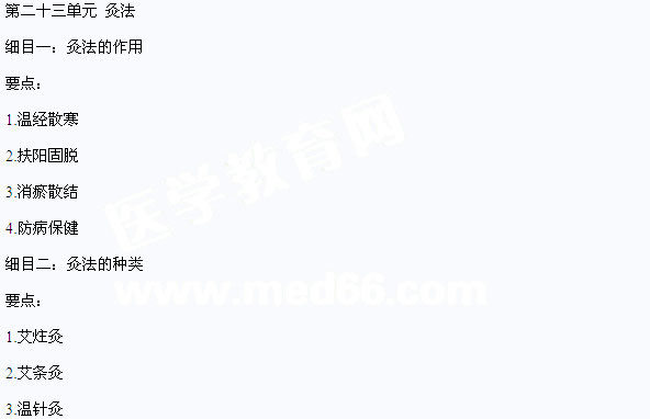 2018中医助理医师考试大纲已经公布,2018中医执业助理医师《针灸学》考试大纲与2017年相比没有变化,为方便广大考生复习,博傲网校将2018中医助理医师《针灸学》考试大纲为大家整理撰文如下,供考生们查看! 第一单元 经络系统 细目一:经络系统组成 细目二:十二经脉 要点: 1.十二经脉的名称 2.十二经脉的分布规律 3.十二经脉属络表里关系 4.十二经脉的循行走向与交接规律 细目三:奇经八脉 要点: 1.奇经八脉的名称 2.奇经八脉的作用 细目四:十五络脉 要点: 十五络脉的分布 细目五:十二经筋 要点: 十二经筋的分布 第二单元 经络的作用和经络学说的临床应用 细目一:经络的作用 要点: 1.联系脏腑,沟通内外 2.运行气血,营养全身 3.抗御病邪,保卫机体 细目二:经络学说的临床应用 要点: 1.诊断方面 2.治疗方面 第三单元 腧穴的分类 要点: 十四经穴、奇穴、阿是穴 第四单元 腧穴的主治特点和规律 细目一:主治特点 要点: 1.近治作用 2.远治作用 3.特殊作用 细目二:主治规律 要点: 分经主治规律 第五单元 特定穴 要点: 1.特定穴的分类及概念 2.五输穴、原穴、络穴、背俞穴、募穴、八脉交会穴、八会穴、郄穴、下合穴、交会穴的内容及临床应用 第六单元 腧穴的定位方法 要点: 1.骨度分寸定位法 2.体表解剖标志定位法 3.手指同身寸定位法 第七单元 手太阴肺经、腧穴 要点: 1.经脉循行 2.主治概要 3.常用腧穴的定位和主治 要点:尺泽、列缺、太渊、鱼际、少商 第八单元 手阳明大肠经、腧穴 要点: 1.经脉循行 2.主治概要 3.常用腧穴的定位和主治要点:商阳、合谷、手三里、曲池、肩髃、迎香 第九单元 足阳明胃经、腧穴 要点: 1.经脉循行 2.主治概要 3.常用腧穴的定位和主治要点:地仓、颊车、下关、头维、天枢、足三里、上巨虚、丰隆、内庭 第十单元 足太阴脾经、腧穴 要点: 1.经脉循行 2.主治概要 3.常用腧穴的定位和主治要点:隐白、公孙、三阴交、阴陵泉、血海 第十一单元 手少阴心经、腧穴 要点: 1.经脉循行 2.主治概要 3.常用腧穴的定位和主治要点:少海、通里、阴郄、神门、少冲 第十二单元 手太阳小肠经、腧穴 要点: 1.经脉循行 2.主治概要 3.常用腧穴的定位和主治要点:少泽、后溪、养老、天宗、听宫 第十三单元 足太阳膀胱经、腧穴 要点: 1.经脉循行 2.主治概要 3.常用腧穴的定位和主治要点:睛明、攒竹、天柱、肺俞、心俞、膈俞、肝俞、胆俞、脾俞、胃俞、肾俞、大肠俞、次髎、委中、承山、昆仑、申脉、至阴 第十四单元 足少阴肾经、腧穴 要点: 1.经脉循行 2.主治概要 3.常用腧穴的定位和主治要点:涌泉、太溪、照海、复溜 第十五单元 手厥阴心包经、腧穴 要点: 1.经脉循行 2.主治概要 3.常用腧穴的定位和主治要点:曲泽、郄门、内关、劳宫 第十六单元 手少阳三焦经、腧穴 要点: 1.经脉循行 2.主治概要 3.常用腧穴的定位和主治要点:中渚、外关、支沟、肩髎、翳风、丝竹空 第十七单元 足少阳胆经、腧穴 要点: 1.经脉循行 2.主治概要 3.常用腧穴的定位和主治要点:听会、阳白、风池、环跳、风市、阳陵泉、悬钟、丘墟、足临泣 第十八单元 足厥阴肝经、腧穴 要点: 1.经脉循行 2.主治概要 3.常用腧穴的定位和主治要点:大敦、行间、太冲、期门 第十九单元 督脉、腧穴 要点: 1.经脉循行 2.主治概要 3.常用腧穴的定位和主治要点:腰阳关、大椎、哑门、百会、水沟、印堂 第二十单元 任脉、腧穴 要点: 1.经脉循行 2.主治概要 3.常用腧穴的定位和主治要点:中极、关元、气海、神阙、中脘、上脘、膻中、廉泉、承浆 第二十一单元 奇穴 要点:常用奇穴的定位和主治要点:四神聪、太阳、夹脊、外劳宫、十宣、膝眼、胆囊、阑尾 第二十二单元 毫针刺法 细目一:针刺准备 要点: 1.消毒 2.体位 细目二:进针方法 要点: 1.指切进针法 2.夹持进针法 3.舒张进针法 4.提捏进针法 细目三:针刺角度和深度 要点: 1.角度 2.深度 细目四:行针与得气 要点: 1.行针的基本手法 2.得气的概念及临床意义 细目五:针刺补泻 要点: 1.捻转补泻 2.提插补泻 3.平补平泻 细目六:针刺异常情况 要点: 1.晕针 2.滞针 3.血肿 4.断针 5.弯针 6.气胸 7.刺伤内脏 8.刺伤脑与脊髓 细目七:针刺注意事项 要点: 1.特殊生理状态的针刺注意事项 2.妊娠妇女、小儿针刺时的注意事项 3.颈项、眼区、胸胁腹背等部位腧穴的针刺注意事项 4.不宜针刺的疾病 细目三:灸法的注意事项 要点: 1.施灸的禁忌 2.灸后处理 第二十四单元 拔罐法 要点: 1.拔罐方法 2.拔罐的作用和适应范围 3.拔罐的注意事项 第二十五单元 其他针法 要点: 1.电针法 2.三棱针法 第二十六单元 治疗总论 细目一:针灸治疗作用 要点: 1.疏通经络 2.凋和阴阳 3.扶正祛邪 细目二:针灸处方 要点: 1.选穴原则 2.配穴方法 第二十七单元 内科病证的针灸治疗 细目一:头痛 要点: 1.头痛的辨证要点 2.头痛的治法 3.头痛的处方 4.头痛的治疗操作 细目二:中风医学 要点: 1.中风的辨证要点 2.中风的治法 3.巾风的处方 4.中风的治疗操作 细目三:眩晕 要点: 1.眩晕的辨证要点 2.眩晕的治法 3.眩晕的处方 4.眩晕的治疗操作 细目四:面瘫 要点: 1.面瘫的辨证要点 2.面瘫的治法 3.面瘫的处方 4.面瘫的治疗操作 细目五:不寐 要点: 1.不寐的辨证要点 2.不寐的治法 3.不寐的处方 4.不寐的治疗操作 细目六:感冒 要点: 1.感冒的辨证要点 2.感冒的治法 3.感冒的处方 4.感