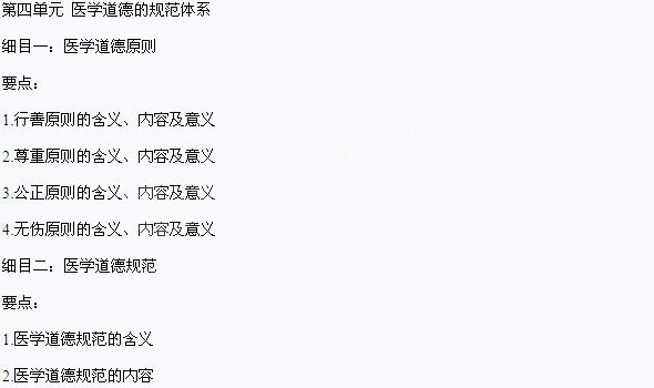 大家都关注的2018年中医助理医师考试大纲已经公布,为了方便广大考生阅读,博傲网校小编特将2018中医助理医师《医学伦理学》考试大纲的详细内容整理如下,供大家免费下载阅读! 免费下载:2018中医助理医师《医学伦理学》考试大纲.doc 第一单元 概述 细目一:伦理与医学伦理 要点: 1.伦理学的概念和规范伦理学的类型 2.医学伦理学的概念和医学道德的作用 3.医学伦理学的研究对象 4.医学伦理学的研究内容 细目二:医学模式与医学目的 要点: 1.医学模式的内涵 2.医学模式的类型 3.医学目的的内涵 第二单元 医学伦理学的历史发展 细目一:中国医学伦理学的历史发展 要点: 1.中国古代医学道德思想的发展过程 2.中国医学道德的优良传统 3.中国近现代医学伦理学的发展 细目二:国外医学伦理学的历史发展 要点: 1.古希腊、古罗马、古印度和阿拉伯国家的医德起源与传统 2.国外近现代医学伦理学的发展 细目三:生命伦理学 要点: 1.生命伦理学产生的背景 第三单元 医学伦理学的理论基础 细目一:生命论 要点: 1.生命神圣论、生命质量论、生命价值论的概念 2.生命质量论的标准及伦理意义 3.生命价值论的标准及伦理意义 细目二:人道论 要点: 1.医学人道主义的含义 2.医学人道主义的核心内容 细目三:美德论 要点: 1.美德论的含义 2.医德品质的含义 3.医德品质的内容 细目四:功利论 要点: 1.功利论的含义 2.功利论的主要特征 细目五:道义论 要点: 1.道义论的含义 2.道义论的主要特征 细目三:医学道德范畴 要点: 1.医学道德范畴的含义 2.医学道德权利的含义和作用 3.医学道德义务的含义和作用 4.医学道德情感的含义和作用 5.医学道德良心的含义和作用 6.医学道德审慎的含义和作用 7.医学道德保密的含义和作用 8.医学道德荣誉的含义和作用 9.医学道德幸福的含义和作用 第五单元 医患关系道德 细目一:医患关系概述 要点: 1.医患关系的内涵 2.医患关系的内容 3.医患关系的模式 4.影响医患关系的主要因素 5.医患关系的发展趋势 细目二:医患双方的权利与义务 要点: 1.医生的权利内容 2.医生的义务内容 3.患者的权利内容 4.患者的义务内容 细目三:医患冲突与沟通 要点: 1.医患沟通的意义 2.医患冲突的原因 3.医患冲突的化解 第六单元 临床诊疗工作中的道德 细目一:临床诊疗工作的医学道德原则 要点: 1.临床诊疗道德的含义 2.临床诊疗的道德原则 细目二:临床诊断工作的道德要求 要点: 1.中医四诊的道德要求 2.体格检查的道德要求 3.辅助检查的道德要求 细目三:临床治疗工作的道德要求 要点: 1.药物治疗中的道德要求 2.手术治疗中的道德要求 3.心理治疗中的道德要求 4.康复治疗中的道德要求 细目四:临床某些科室的道德要求 要点: 1.急诊科(室)的工作特点及道德要求 2.传染科(室)的工作特点及道德要求 第七单元 医学科研工作的道德 细目一:医学科研工作的基本道德要求 要点:医学科研道德的基本要求 细目二:医学人体实验工作的道德 要点: 1.人体实验的类型 2.人体实验的道德原则 第八单元 医学道德的评价、教育和修养 细目一:医学道德评价 要点: 1.医学道德评价的标准 2.医学道德评价的依据 3.医学道德评价的方式 细目二:医学道德教育 要点: 1.医学道德教育的意义 2.医学道德教育的过程 细目三:医学道德修养 要点: 1.医学道德修养的含义 2.医学道德修养的途径 第九单元 生命伦理学 细目一:生命伦理学研究的内容及伦理原则 要点: 1.实施人类辅助生殖技术的伦理原则 2.人体器官移植的伦理原则 3.人类胚胎干细胞研究和应用的伦理原则 4.基因诊断和基因治疗的伦理原则 5.死亡标准与安乐死的伦理问题 细目二:生命伦理学最新重要文献 要点: 1.贝尔蒙报告(保护人类受试者的伦理原则与准则)(1979年) 2.赫尔辛基宣言(涉及人类受试者医学研究的伦理准则)(2000年修订) 3.生命伦理学吉汉宣言(2000年) 4.国际性研究中的伦理与政策问题:发展中国家的临床试验(2001年) 5.国际人类基因组组织(HUGO)伦理委员会关于人类基因组数据库的声明(2002年) 6.国际医学科学组织委员会《人体生物医学研究国际道德指南》(2002年8月修订) 7.《突发公共卫生事件应急条例》(2003年5月9日国务院375号令) 8.中华人民共和国卫生部《人类辅助生殖技术和人类精子库伦理原则》(2003年) 9.中华人民共和国国家食品药品监督管理局《药物临床试验质量管理规范》(2003年) 10.中华人民共和国科技部、卫生部《人胚胎干细胞研究伦理指导原则》(2003年) 19年来,我们只做医考培训,我们不是招生最多的,但是我们是通过率最高的!医师考试通过率低,怎么才能一考过关呢?通关技巧热线:400-1680561 你想知道一考过关的秘籍吗?扫描下面的“eduyishi”微信二维码或加QQ群号,即可提前获取最新必考知识点,说不定有考试原题哦: 临床执业/助理医师问题讨论群:249310992 扫一扫关注博傲医师微信公众号 博傲金题App免费下载,注册时输入邀请码1460[海量试题][历年真题]