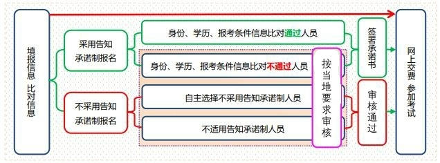 采用告知承诺制,若身份、学历、报考条件信息在线核验都通过的人员,可直接签署承诺书,缴费,完成报名。报名期间无须进行资格审核。若身份、学历、报考条件信息在线核验有不通过的人员,需要按照当地要求进行人工审核,审核通过再缴费。